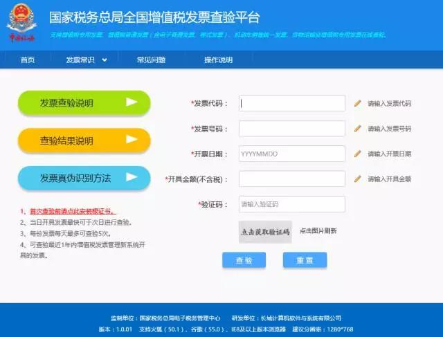 自2017年1月1日起,取得增值稅發(fā)票的單位和個人可登陸全國增值稅發(fā)票查驗平臺(https://inv-veri.chinatax.gov.cn/),對新系統(tǒng)開具的增值稅專用發(fā)票、增值稅普通發(fā)票、機(jī)動車銷售統(tǒng)一發(fā)票和增值稅電子普通發(fā)票的發(fā)票信息進(jìn)行查驗。單位和個人通過網(wǎng)頁瀏覽器平臺首次登錄平臺,應(yīng)下載安裝根證書文件,查看平臺提供的發(fā)票查驗操作說明。