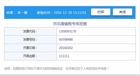 (3)不一致:納稅人輸入的發(fā)票信息與稅務(wù)機(jī)關(guān)電子信息至少有一項不一致,如確認(rèn)輸入的查驗項目與票面一致,請與開票方或開票方主管稅務(wù)機(jī)關(guān)聯(lián)系核實。