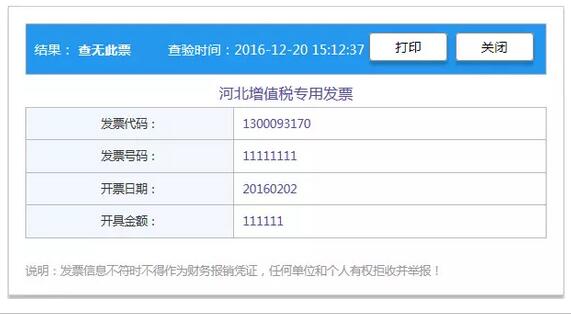 (4)查無此票:由于存在開具方離線自開票、發(fā)票電子數(shù)據(jù)的同步滯后(通常至少1天)、查驗人錄入錯誤等問題,導(dǎo)致相關(guān)發(fā)票在稅務(wù)機(jī)關(guān)的電子信息中無法檢索到。如果確認(rèn)輸入項無誤后,請于第二天再行查驗。