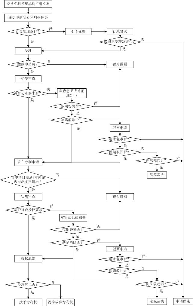 1、國內(nèi)專利申請所需文件及資料 申請發(fā)明專利的,申請文件應(yīng)當(dāng)包括:發(fā)明專利請求書、說明書(必要時應(yīng)當(dāng)有附圖)、權(quán)利要求書、摘要及其附圖,各一式兩份。涉及氨基酸或者核苷酸序列 的發(fā)明專利申請,說明書中應(yīng)包括該序列表,并把該序列表作為說明書的一個單獨部分提交,同時還應(yīng)提交符合國家知識產(chǎn)權(quán)局規(guī)定的記載有該序列表的光盤或軟 盤。 申請實用新型專利的,申請文件應(yīng)當(dāng)包括:實用新型專利請求書、說明書、說明書附圖、權(quán)利要求書、摘要及其附圖,各一式兩份。 申請外觀設(shè)計專利的,申請文件應(yīng)當(dāng)包括:外觀設(shè)計專利請求書、圖片或者照片,各一式兩份。要求保護(hù)色彩的,還應(yīng)當(dāng)提交彩色圖片或者照片一式兩份。提交 圖片的,兩份均應(yīng)為圖片,提交照片的,兩份均應(yīng)為照片,不得將圖片或照片混用。如對圖片或照片需要說明的,應(yīng)當(dāng)提交外觀設(shè)計簡要說明,一式兩份。 2、如何撰寫技術(shù)交底書 一份技術(shù)交底書,清楚地描述該發(fā)明的技術(shù)方案和構(gòu)思,可按下述八個部分撰寫: 1)名稱; 2)技術(shù)領(lǐng)域; 3)現(xiàn)有技術(shù):引證與發(fā)明或?qū)嵱眯滦蛯@暾堊罱咏默F(xiàn)有技術(shù)文件,并客觀指出背景技術(shù)中存在的問題和缺點; 4)目的:應(yīng)針對背景技術(shù)中存在的問題,寫明由該申請的說明書所公開的技術(shù)方案所能解決的技術(shù)問題; 5)技術(shù)方案及發(fā)明要點:寫明申請人對其要解決的技術(shù)問題所采取的技術(shù)措施的集合,是該發(fā)明或?qū)嵱眯滦蜕暾埖暮诵牟糠郑?nbsp; 6)有益效果:有根據(jù)地寫明由本發(fā)明或?qū)嵱眯滦偷募夹g(shù)特征帶來的,或者是由所述的技術(shù)特征必然產(chǎn)生的與現(xiàn)有技術(shù)相比所具有的有益效果; 7)附圖及其簡要說明; 8)實現(xiàn)發(fā)明或?qū)嵱眯滦偷淖詈梅绞剑涸敿?xì)描述實施本發(fā)明或者實用新型的具體例子,尤其應(yīng)對本發(fā)明和實用新型區(qū)別于現(xiàn)有技術(shù)的技術(shù)特征及附加技術(shù)特征進(jìn)行足夠詳細(xì)的描述。 3、國內(nèi)專利申請業(yè)務(wù)流程圖